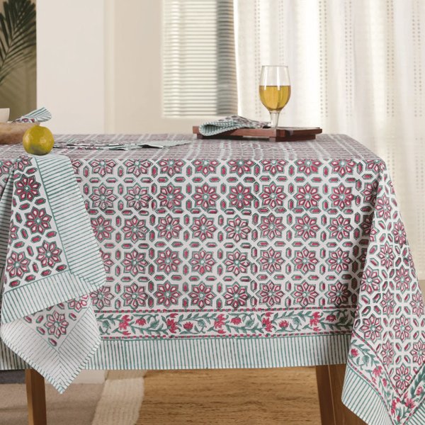 Hand Block Printed Cotton Tablecloth – Cranberry Red & Blue Floral Design